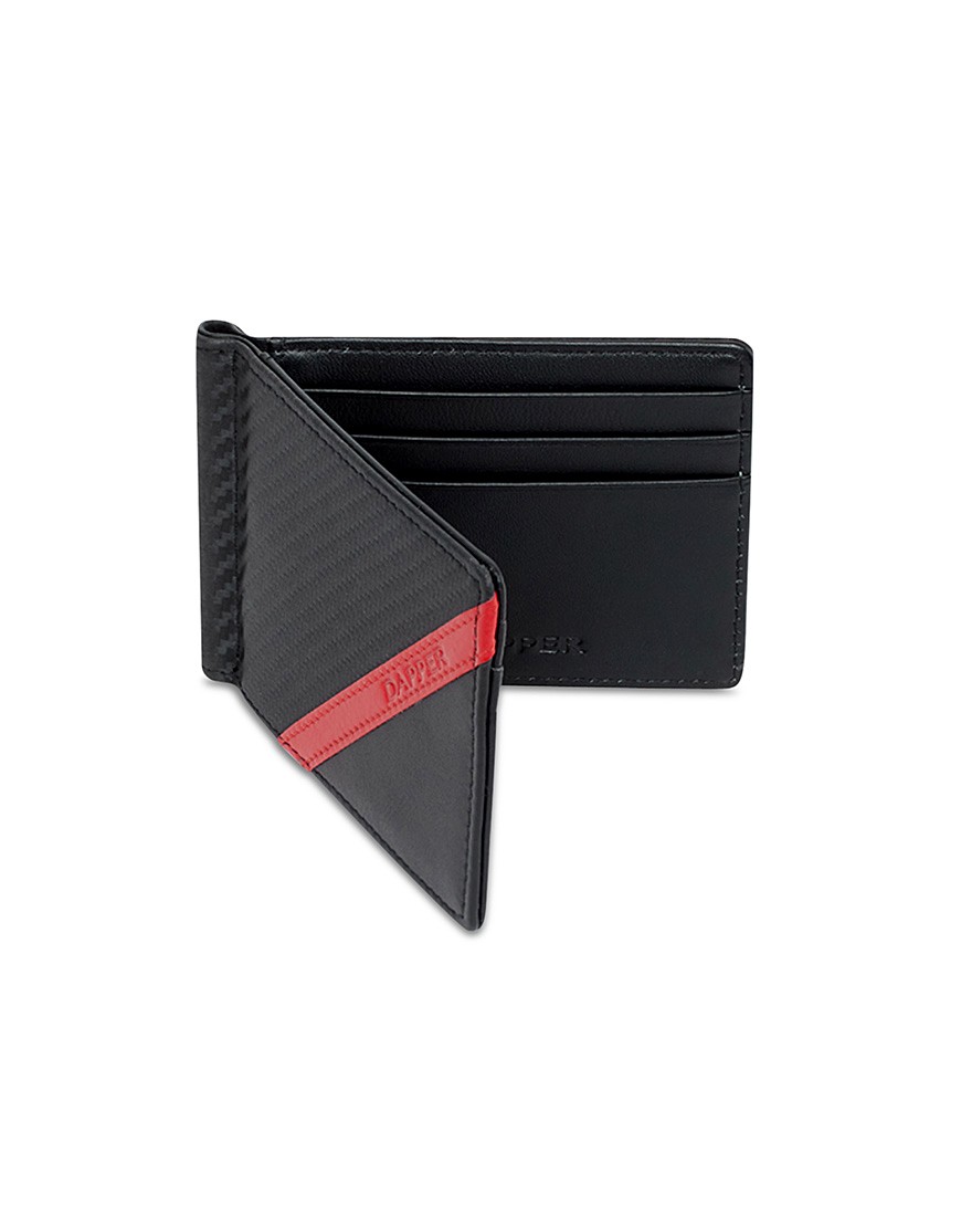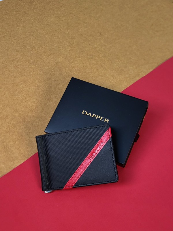 Carbon fiber Diagonal money clip wallet in black, red and Carbon fiber leather. with two inside pockets and six credit card slots Shiny Black metal clip for keep your bank note. Body made from genuine leather in black, red and Carbon fiber leather.