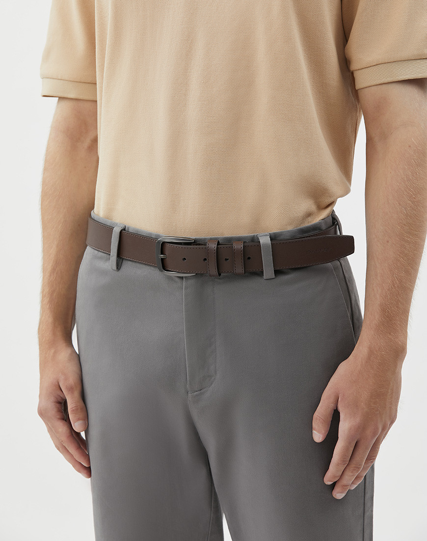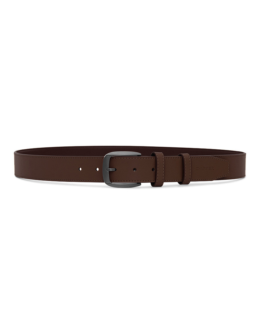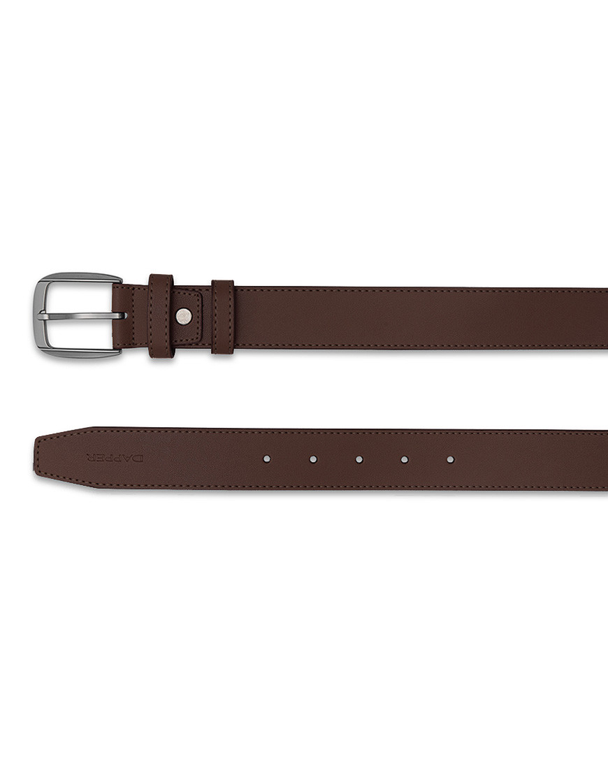 Pin Buckle Vegan Leather belt made of Smooth brown vegan leather work with tailoring occasion. Buckle made of Lightweight Zinc Alloy in Modern classic shape, Matte Gun metal finishing Leather strap can be cut to fit with Dapper logo debossed at the end of strap. Timeless & Versatile