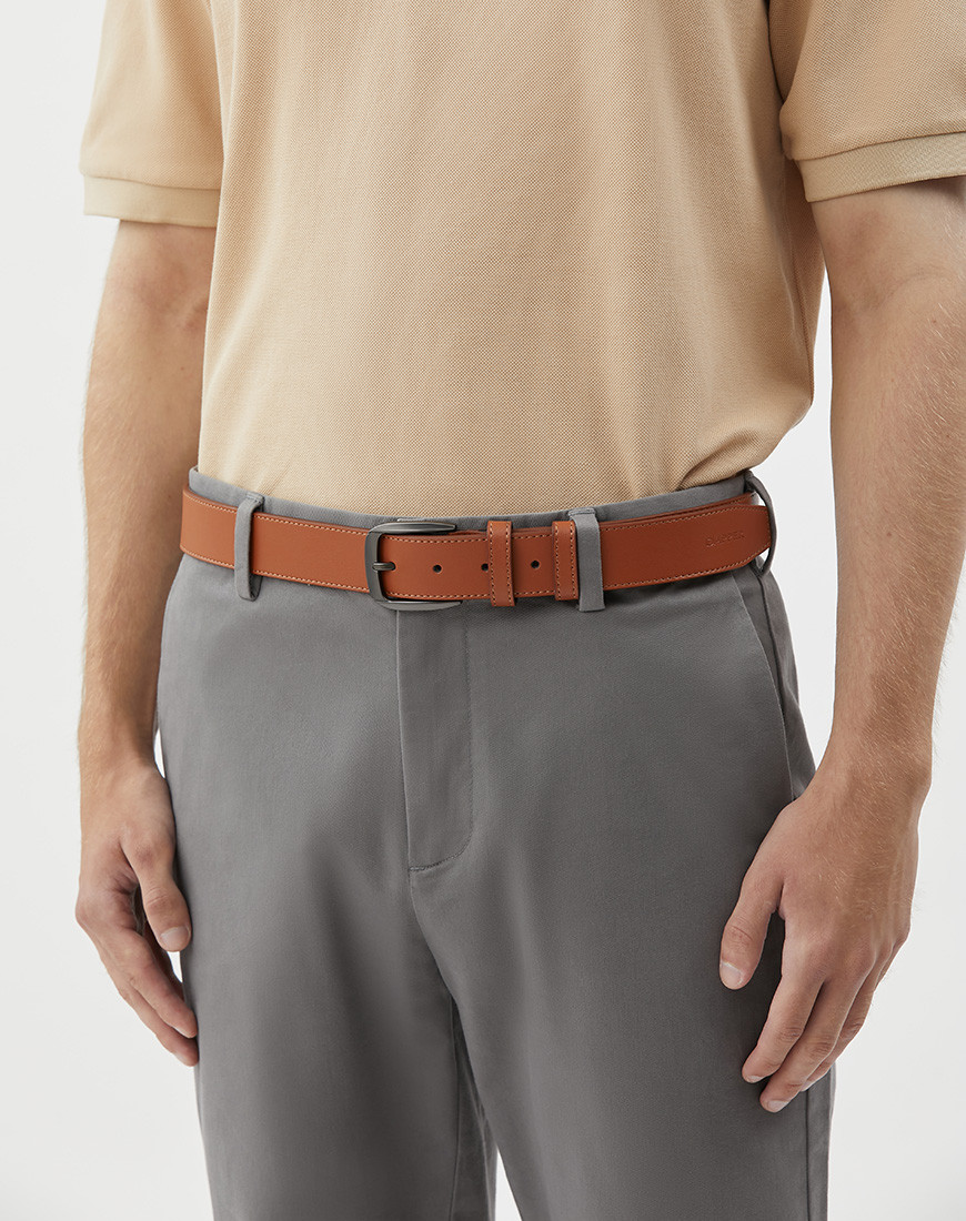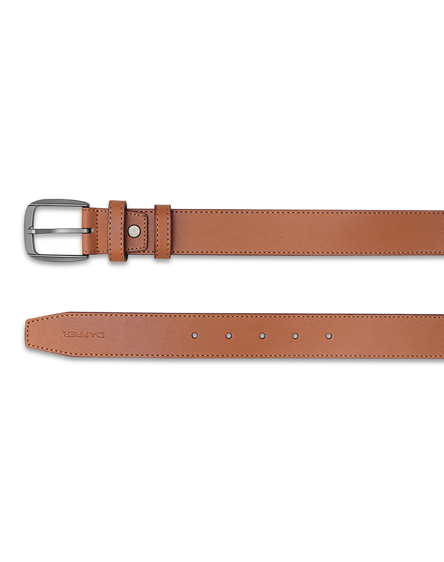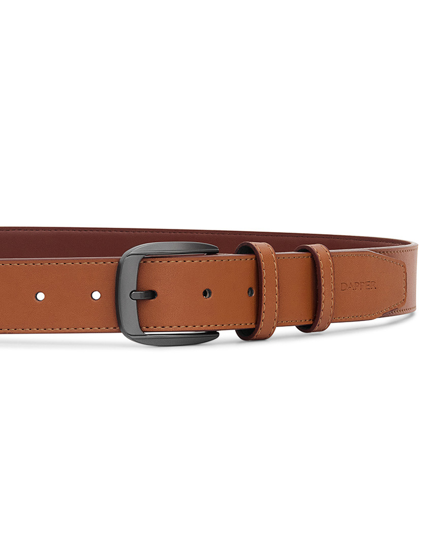 Pin Buckle Vegan Leather belt made of Smooth tan brown vegan leather work with tailoring occasion. Buckle made of Lightweight Zinc Alloy in Modern classic shape, Matte Gun metal finishing Leather strap can be cut to fit with Dapper logo debossed at the end of strap. Timeless & Versatile