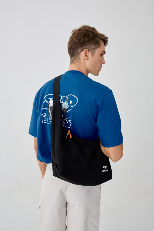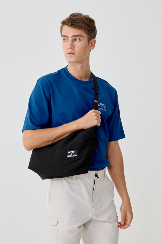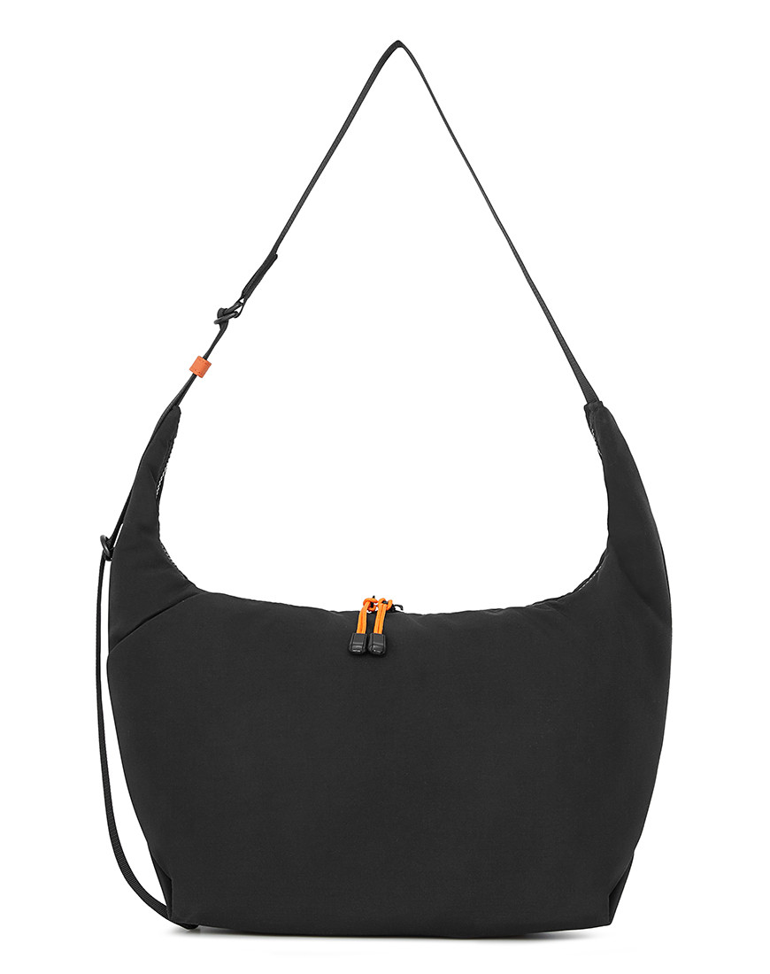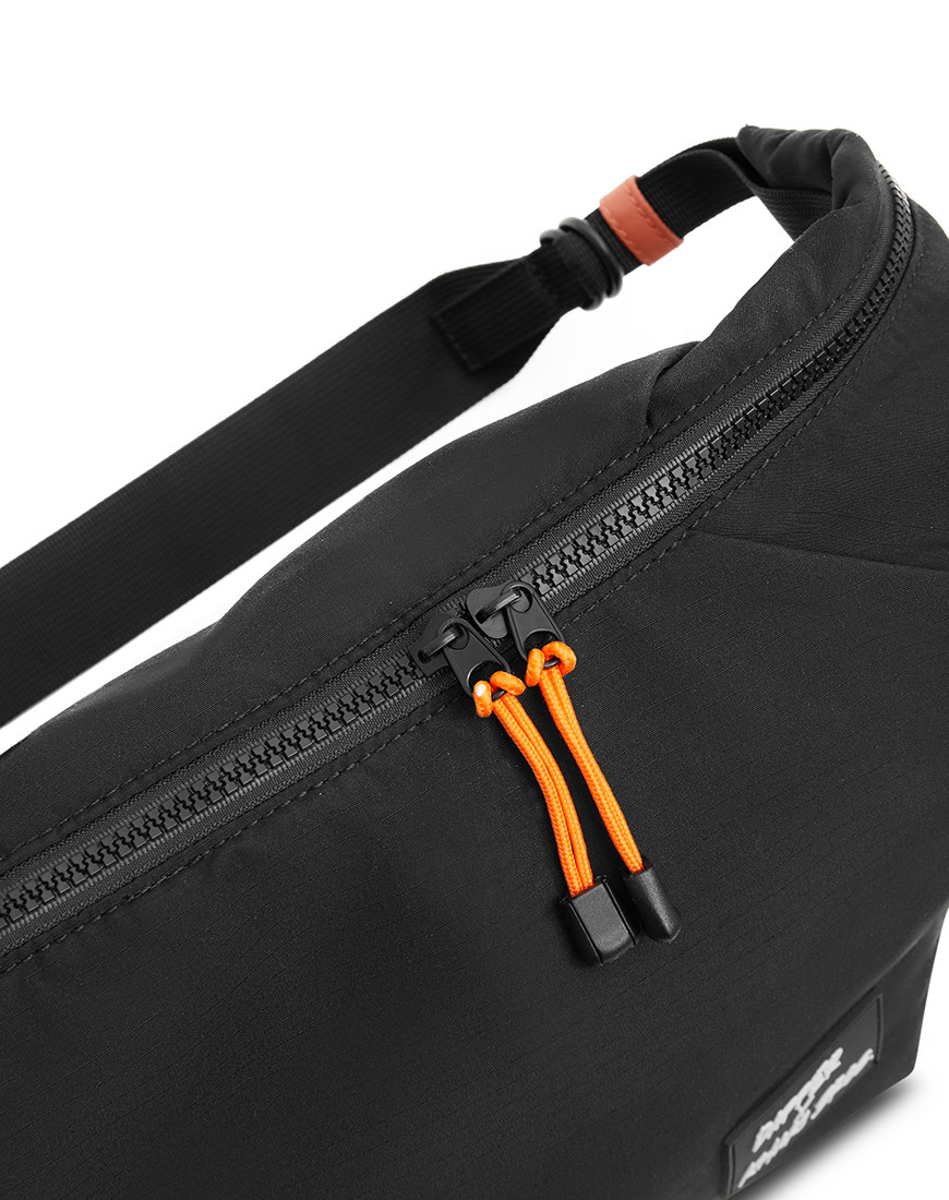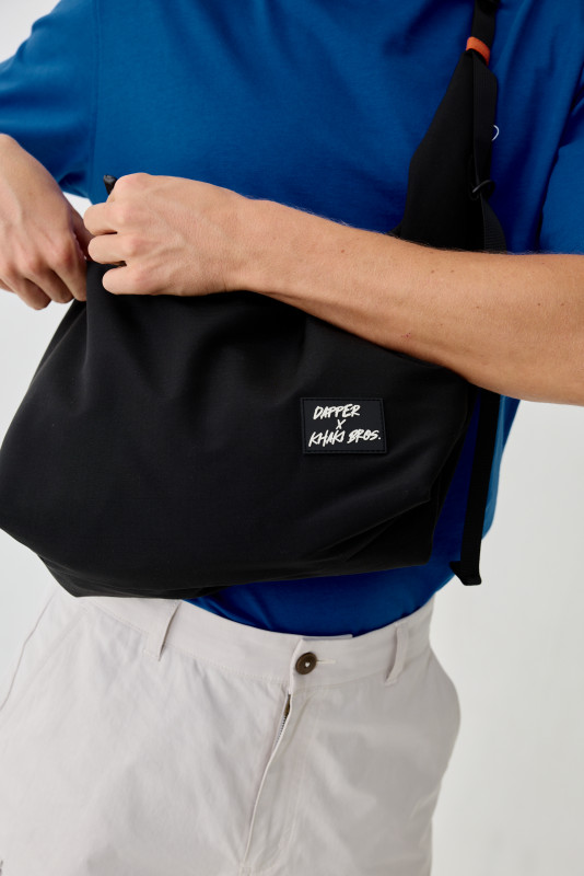 Dapper X Khaki Bros. Soft Ripstop Crossbody Bag made from Black soft ripstop fabric with a distinctive natural texture. Medium size bag suitable for carrying your everyday essentials. Wide Opening with double slide fasteners. Five pockets. including two slashed pockets on the outside perfect for water bottle and phone. Decorated with Orange accent Lining Fabric, zip puller and loop