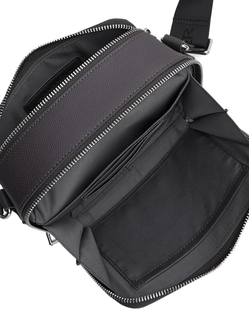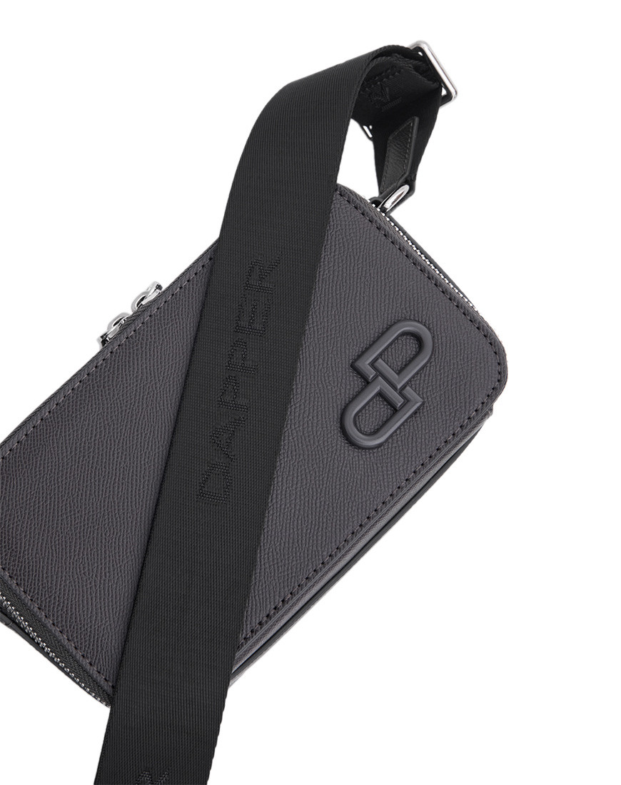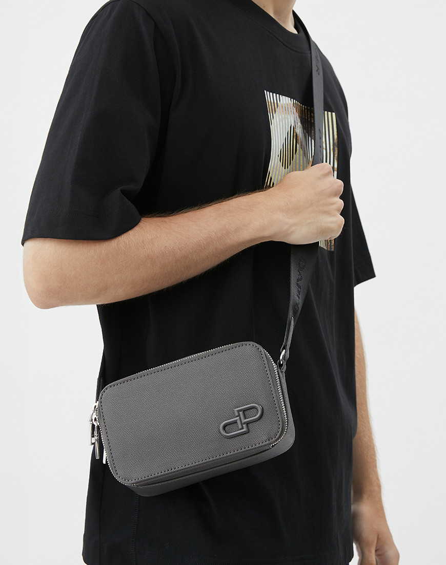 DP Iconic Boxy Crossbody bag is crafted from Grey Cross grain PU. Decorated with Matte Grey logo with Shiny Silver hardware. Comfortable to carry, thanks to its adjustable logo strap, it opens to reveal a gusseted interior large enough to hold two phones as well as cash, cards and other small essentials. 2 outside zipped pockets 2 inside flat pockets, 6 cars slots. This Crossbody is Wearable wallet