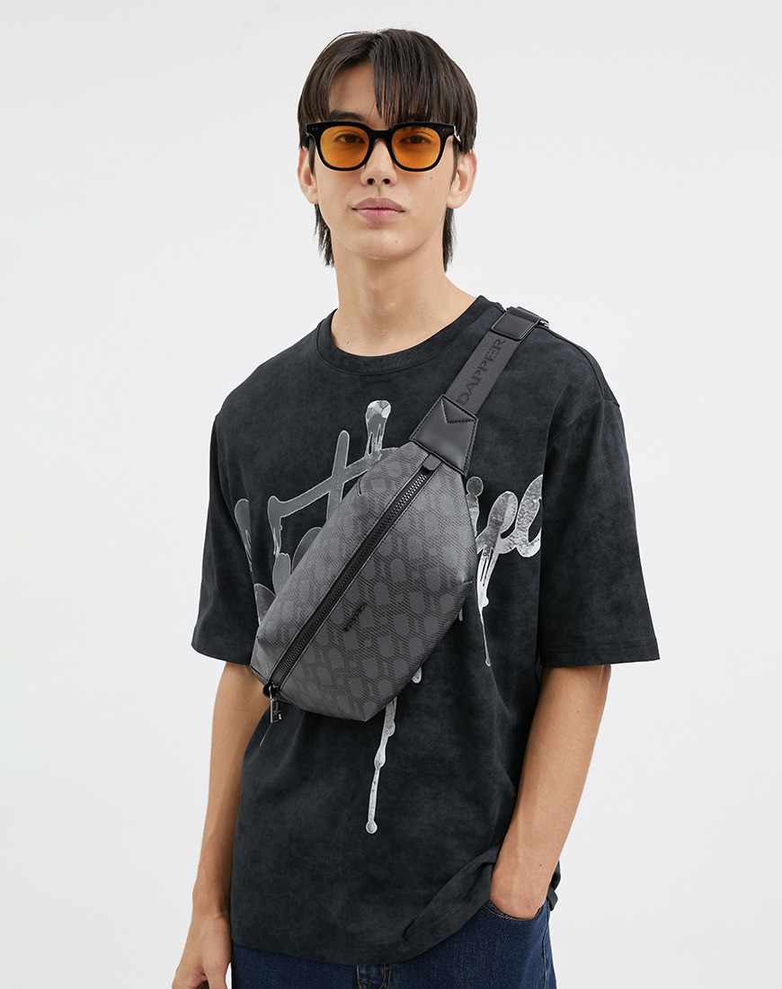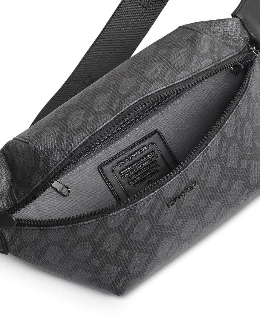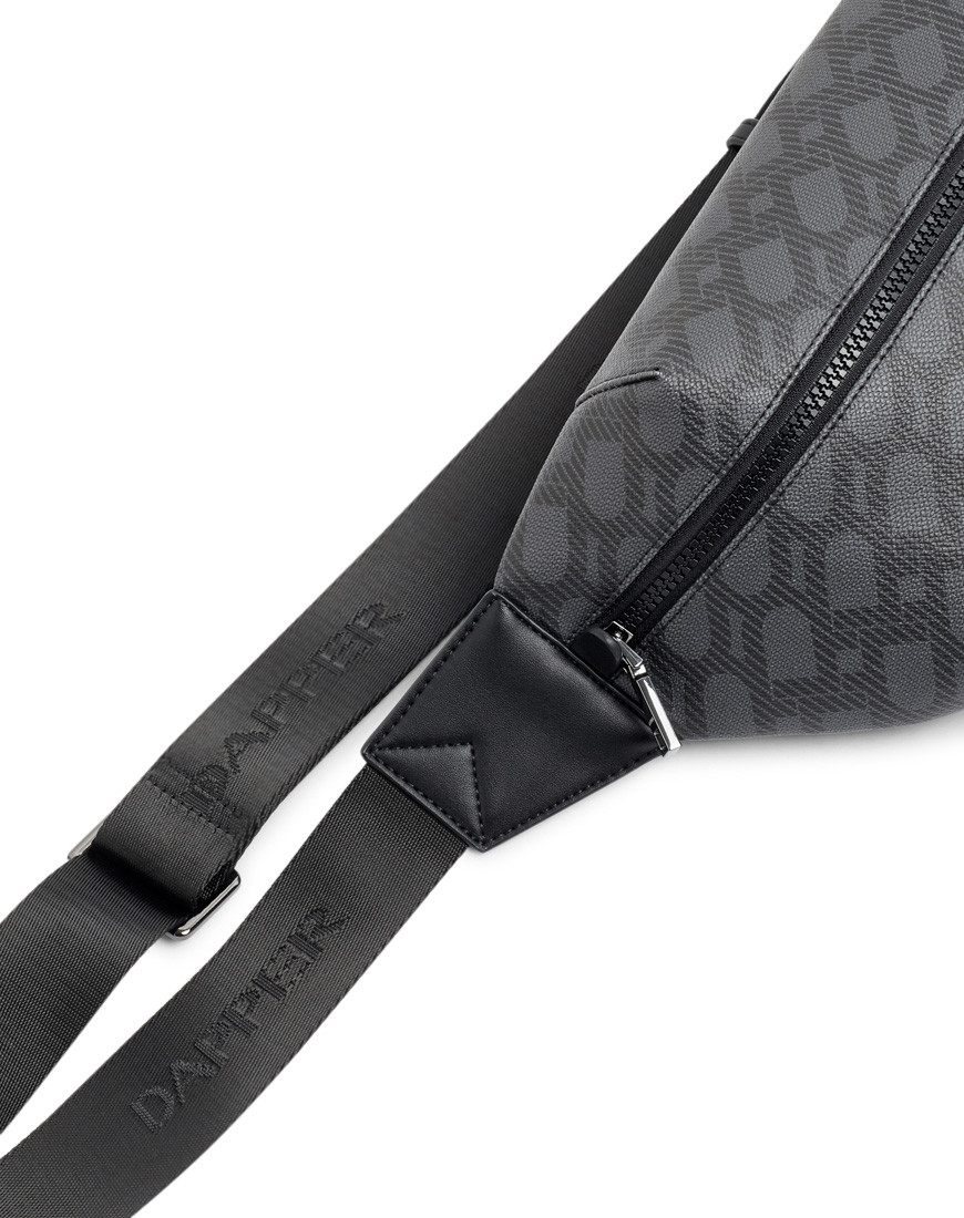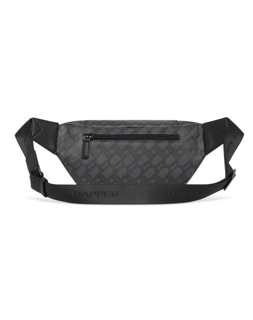 DP Interlock Monogram belt bag, crafted in grey cross grain with DP interlock monogram printed in black match with black smooth faux leather, shiny black hardware, Black webbing strap with Dapper logo. front smooth plastic zip fastening, a back nylon zip pocket for secured items. one slip pocket and zipper pocket inside, Gun metal Dapper logo & accessories. adjustable buckle