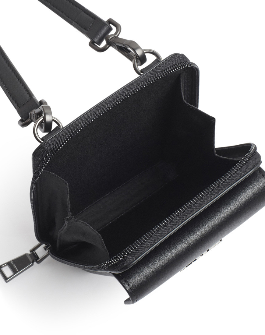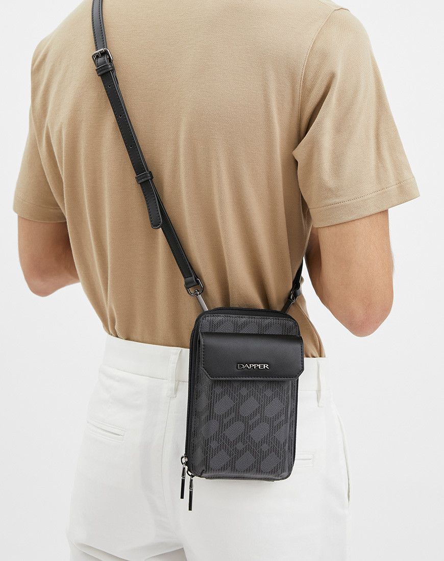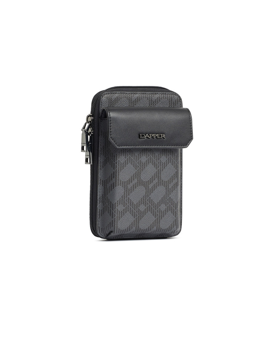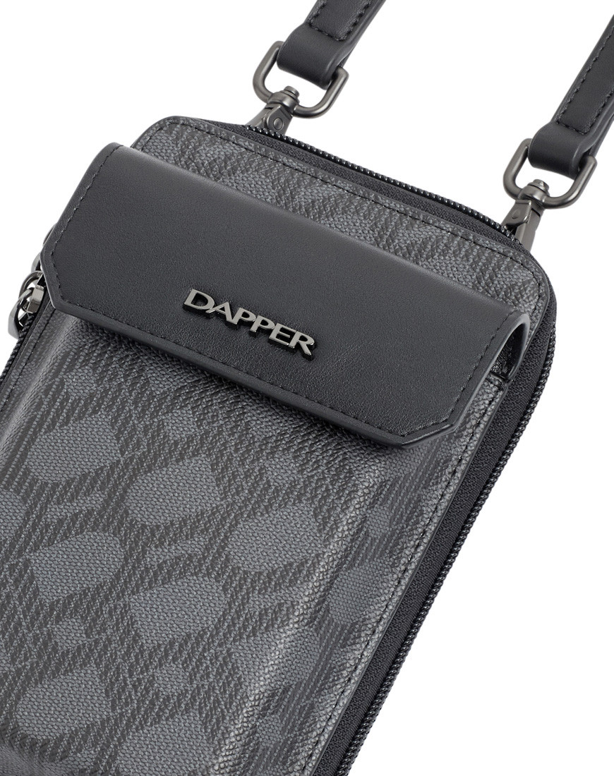 Crossbody Phone Pouch is all about low-key elegance. The gusseted main compartment opens wide for easy access to a mobile phone and other belongings supplemented by a front flap pocket Adjustable strap for hand-free carry Black metal hardware match with DAPPER logo in front of flap pocket. Grey cross grain with DP interlock monogram printed in black match with black PU
