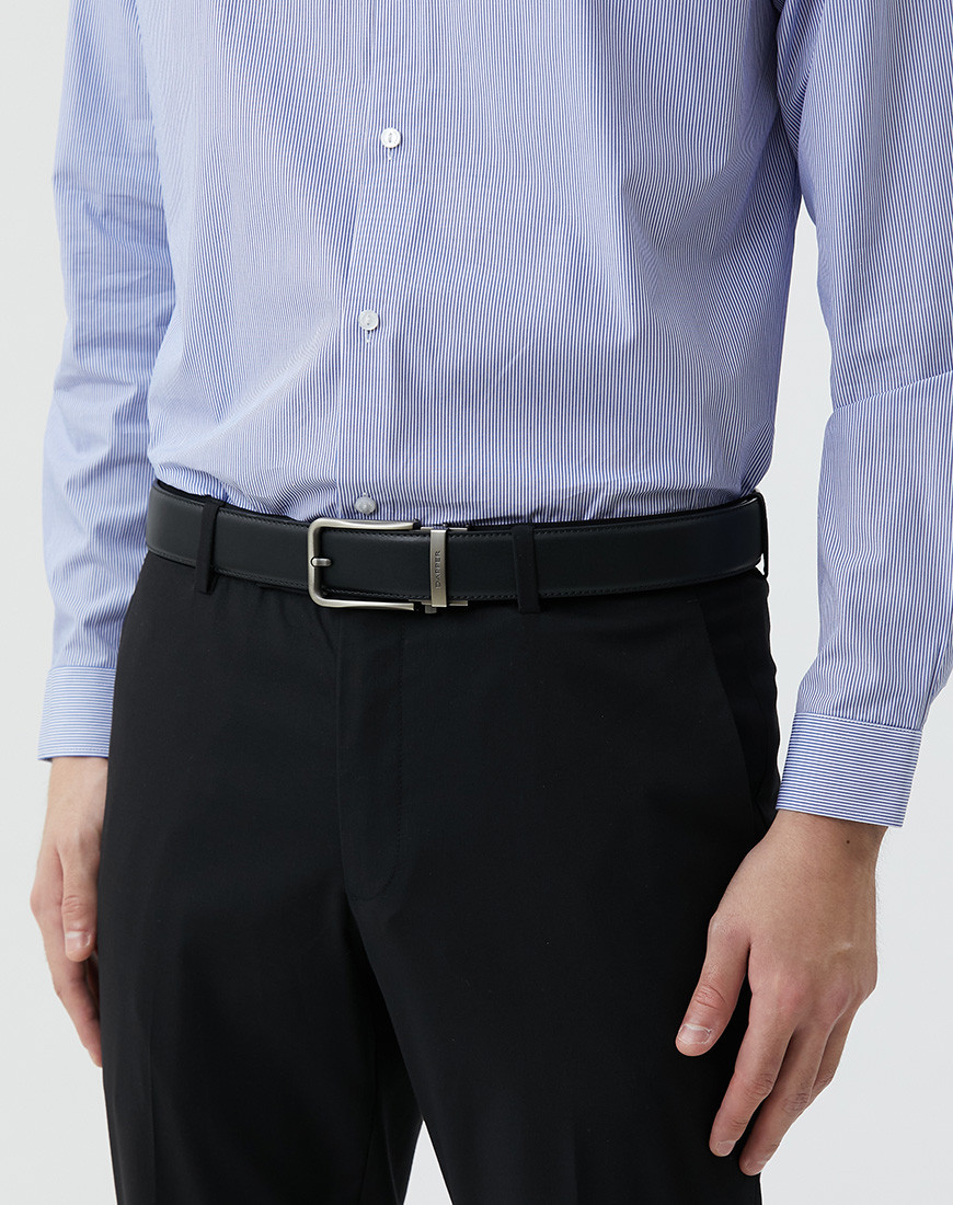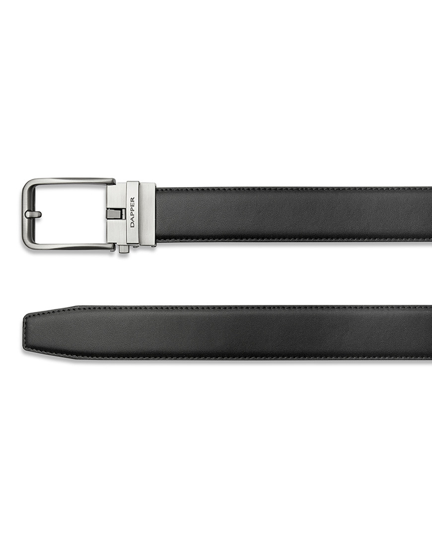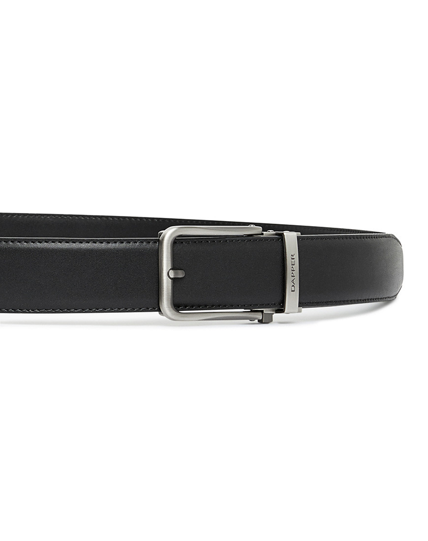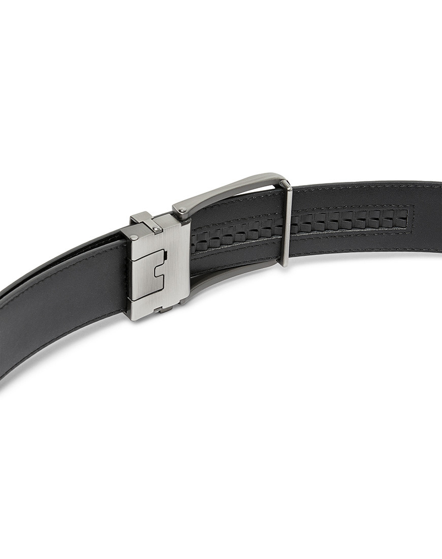 Leather Ratchet belt with Automatic click buckle made of Black Smooth genuine leather strap with edge stitched for strong and durability. Buckle made of Zinc Alloy in Modern Brushed Gun metal finishing. Buckle look like Pin buckle but easy to tighten or loose Push side button & pull to release.