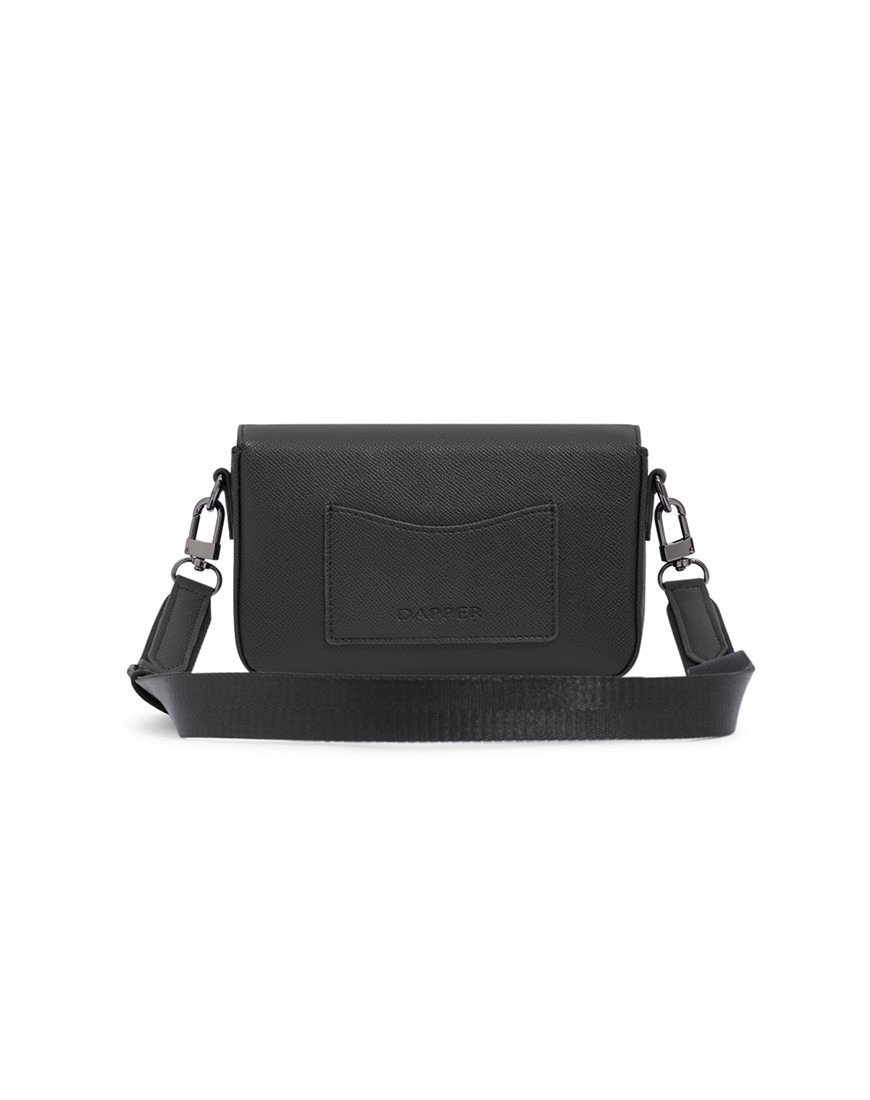 Dapper Mini Crossbody bag with DP interlock monogram lining The bag is minimalist design asserts a maximum of sleek style. Crafted with Black Faux leather soft touch Protected by a flap with precision-cut corners it’s ideal for carrying a mobile phone match with Antistatic DP interlock monogram printed lining. Detachable shoulder strap. back part has easycard pocket