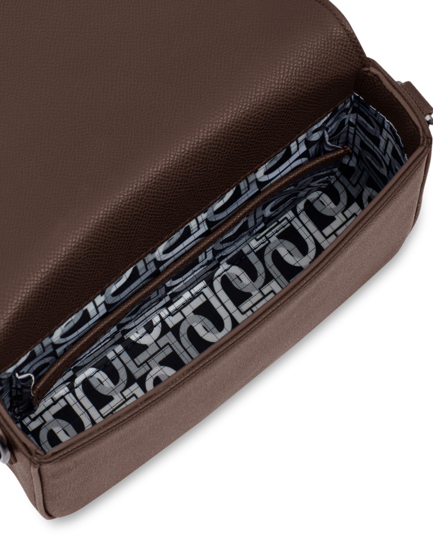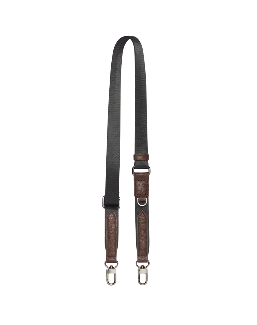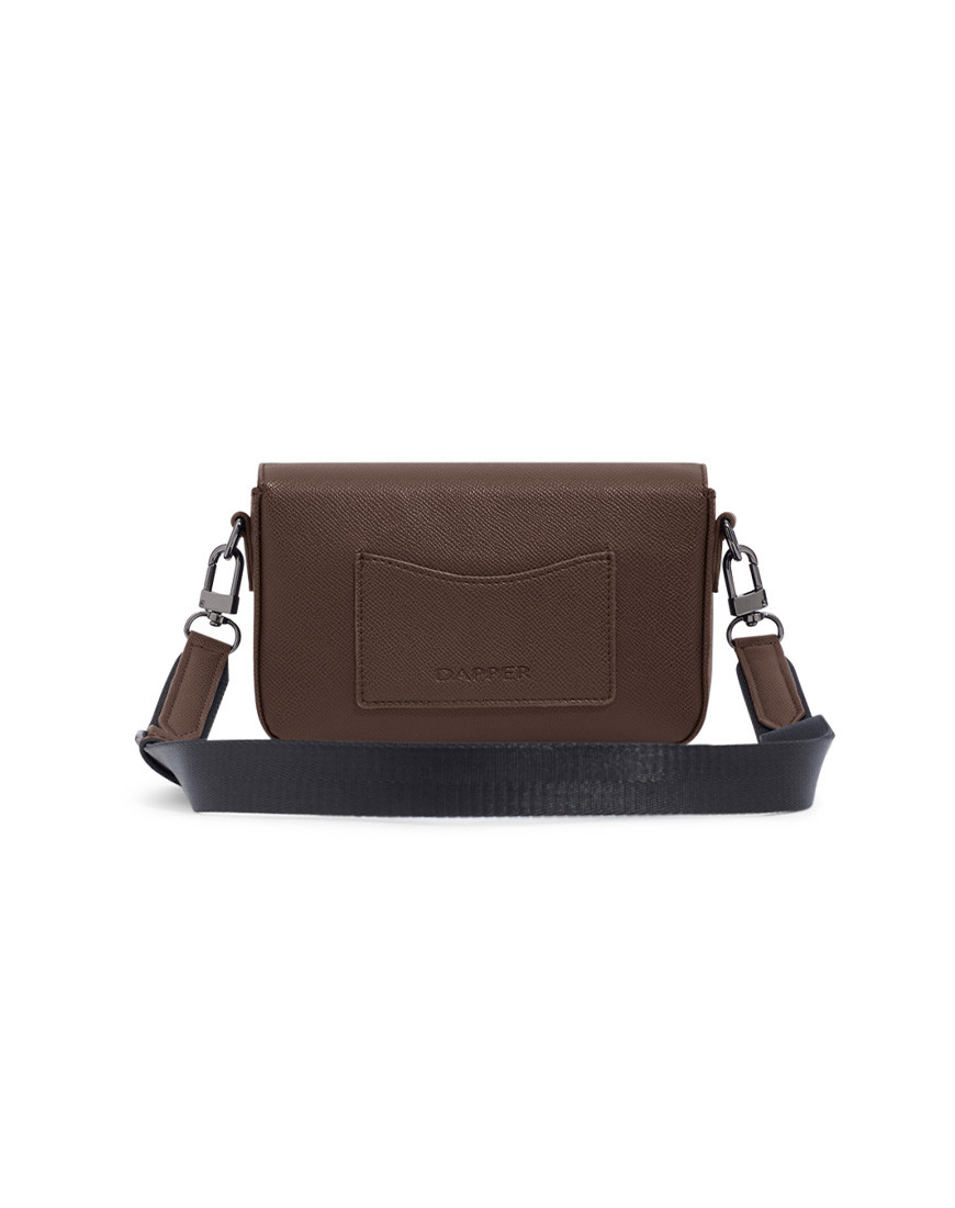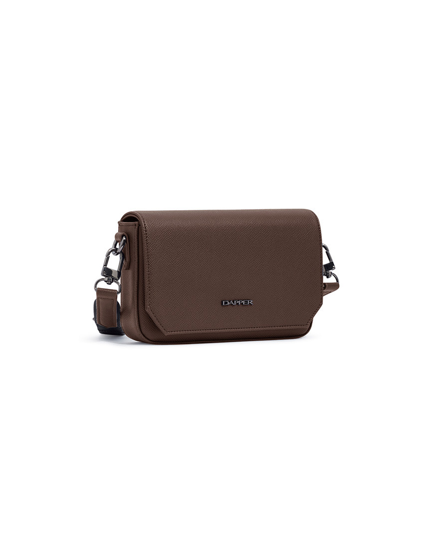 Dapper Mini Crossbody bag with DP interlock monogram lining The bag is minimalist design asserts a maximum of sleek style. Crafted with Brown Cross grain Faux leather Protected by a flap with precision-cut corners it’s ideal for carrying a mobile phone match with Antistatic DP interlock monogram printed lining. Detachable shoulder strap. back part has easycard pocket