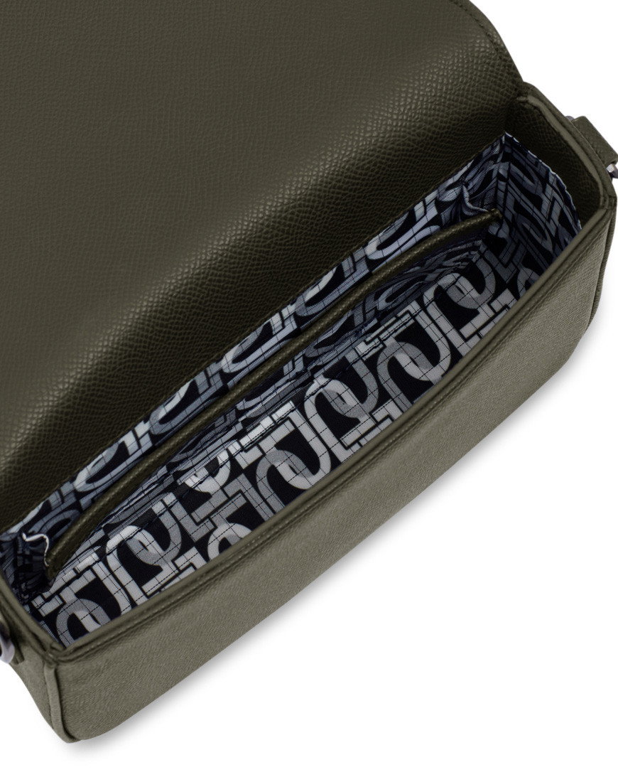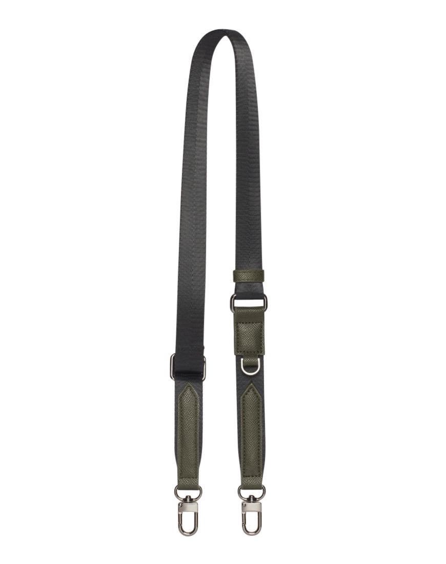 Dapper Mini Crossbody bag with DP interlock monogram lining The bag is minimalist design asserts a maximum of sleek style. Crafted with Olive Cross grain Faux leather Protected by a flap with precision-cut corners it’s ideal for carrying a mobile phone match with Antistatic DP interlock monogram printed lining. Detachable shoulder strap. back part has easycard pocket
