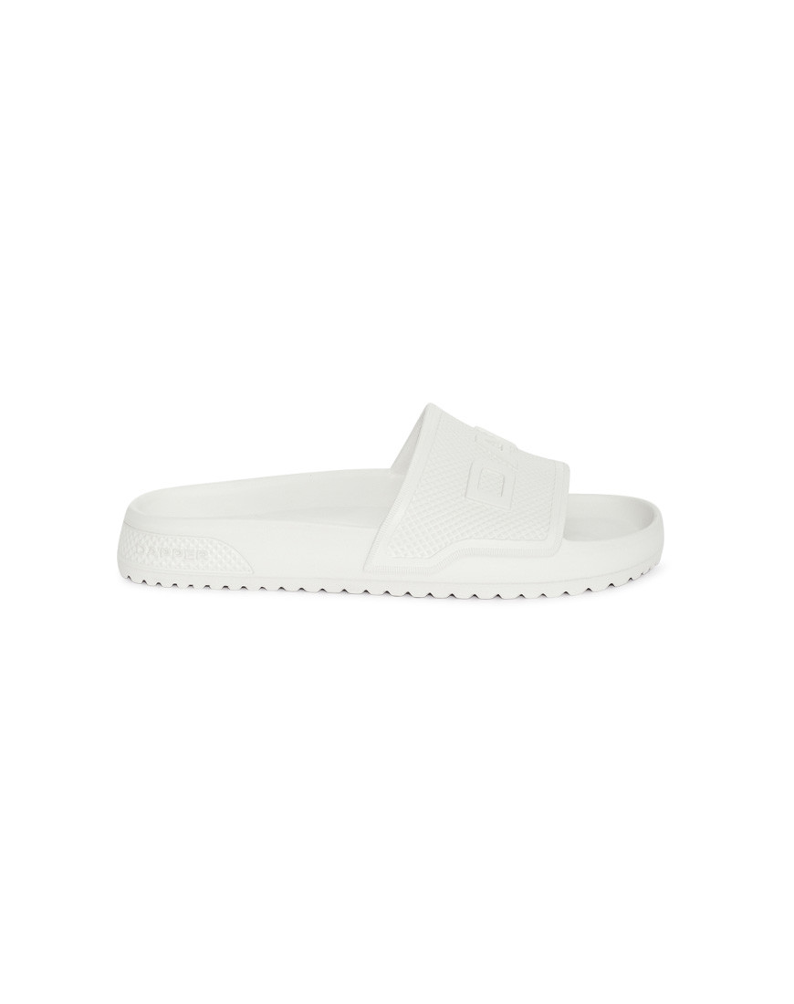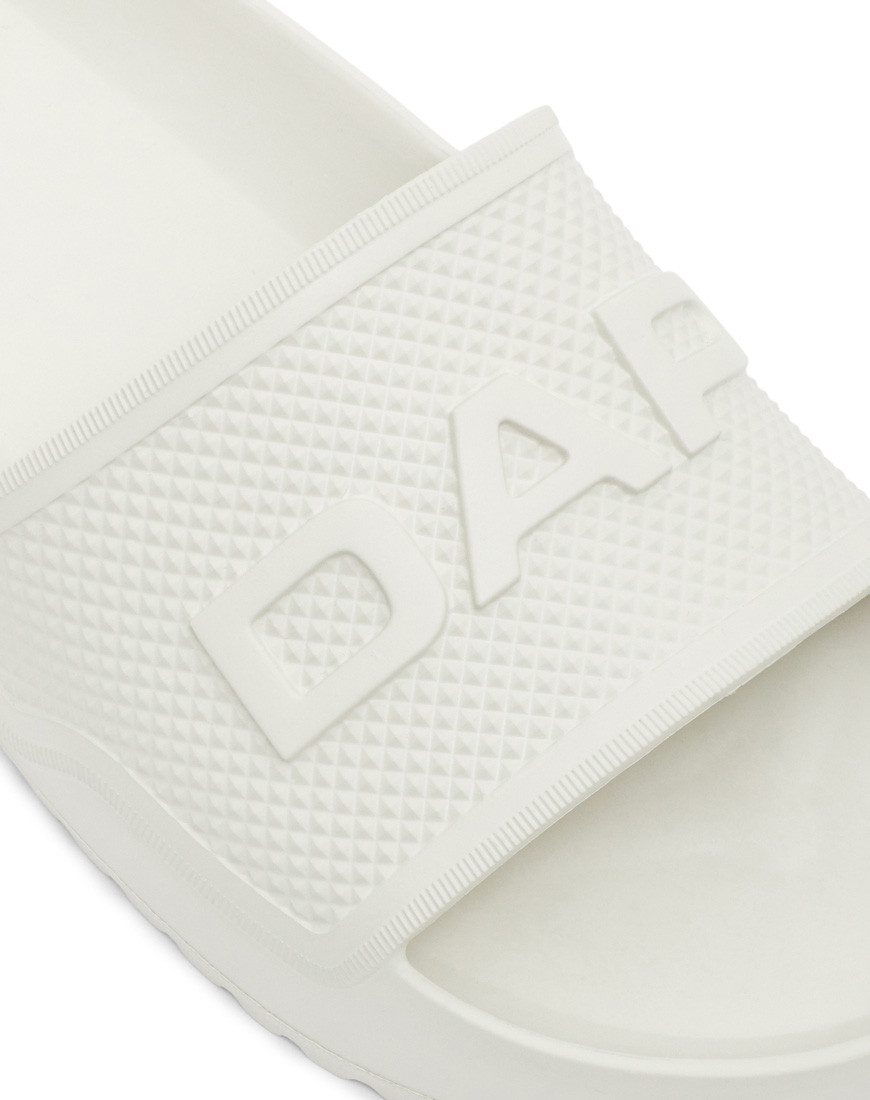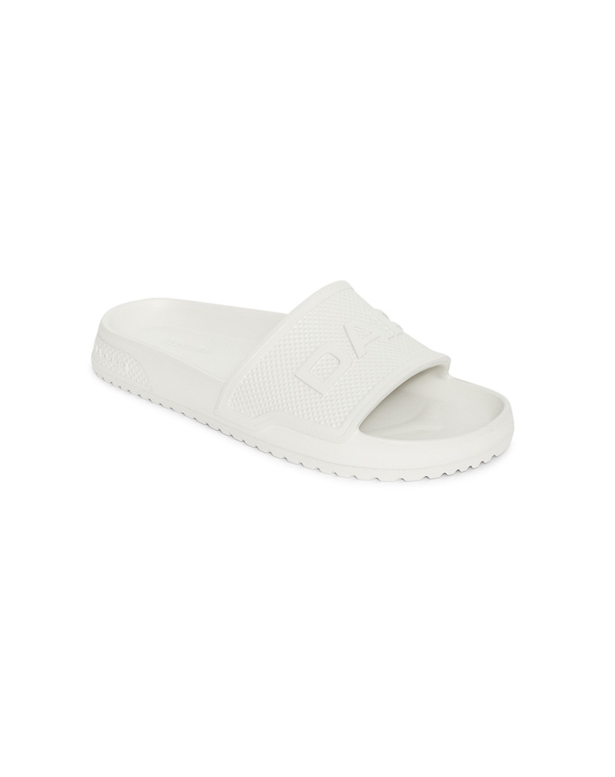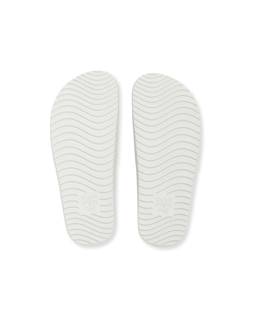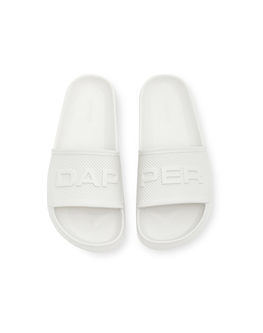 DAPPER monochrome pool slide sandals. Chunky rubber sole and wide strap across the instep. DAP and PER typo embossed Textured detail on the instep and heel. This sandals made from 100% injection molded EVA in white. water-resistant and flexible