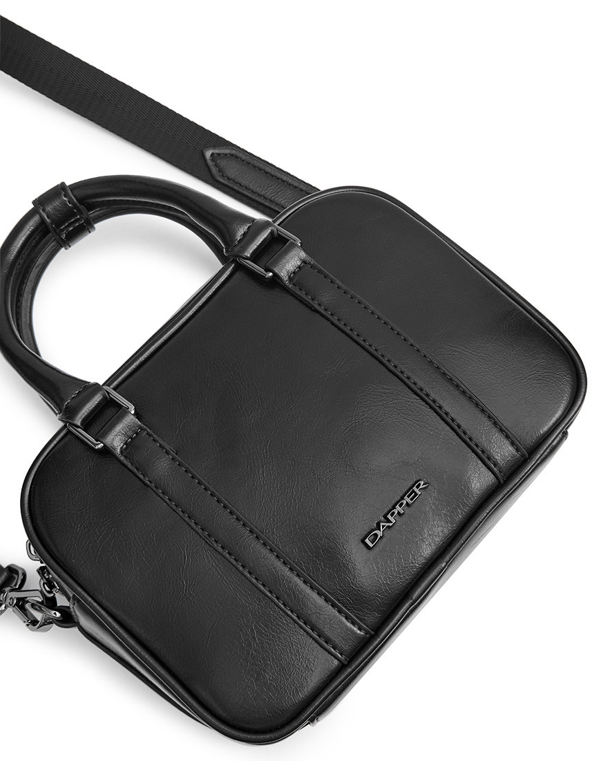 Top Handle Crossbody in Wrinkle-Effect Faux Leather in black Which features insert vertical card pocket on the back panel. Main compartment with shiny metal zip closure. One is slip pocket inside Other side with nylon zip pocket. Polished shiny black metal logo & other hardware. Detachable and removable shoulder strap with mini D-ring for Attached key ring. Top handle with Snap button