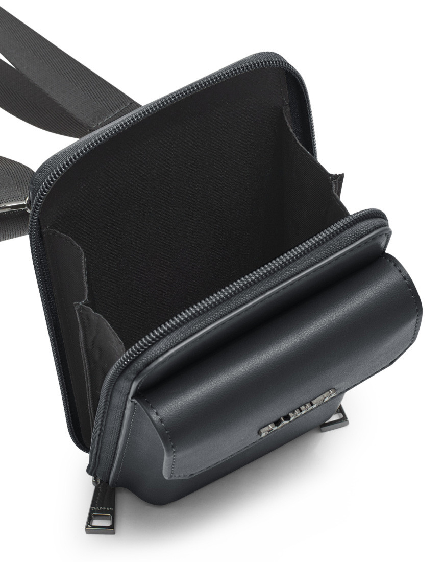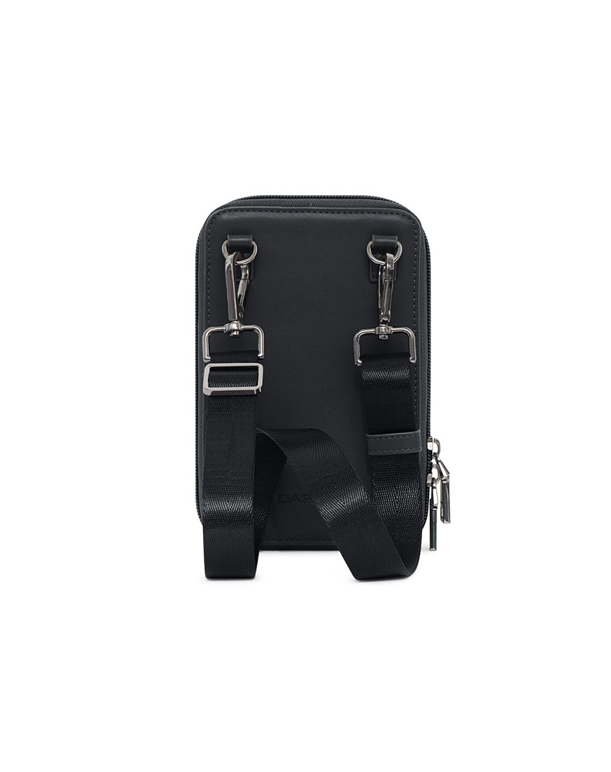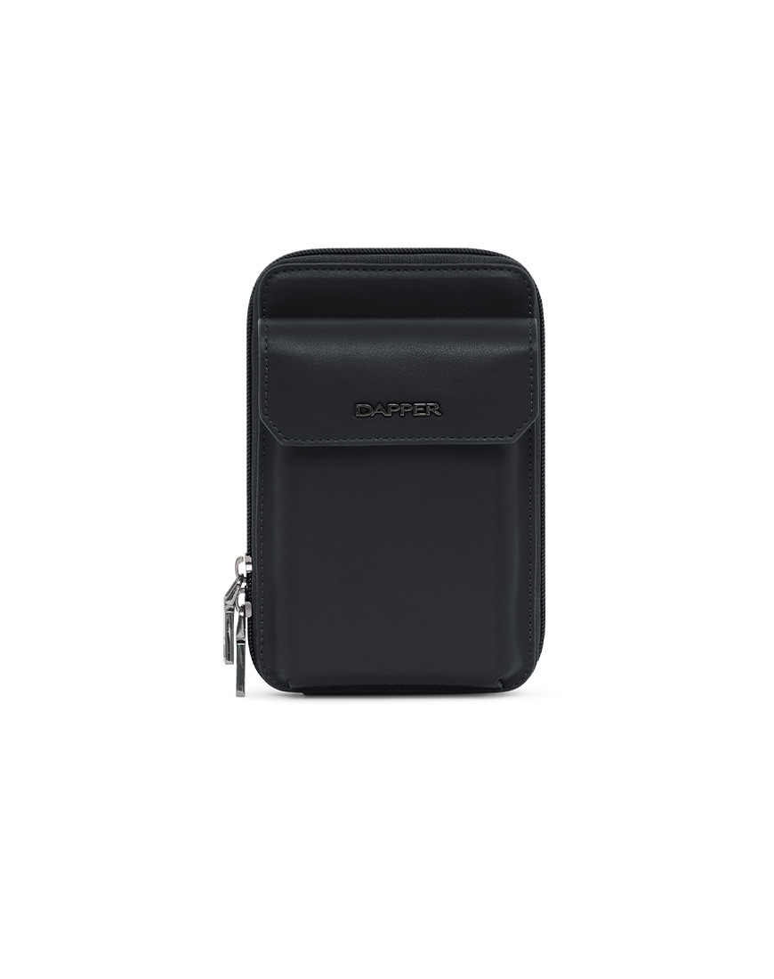 Crossbody Phone Pouch is all about low-key elegance. The gusseted main compartment opens wide for easy access to a mobile phone and other belongings supplemented by a front flap pocket. adjustable strap for hand-free carry. Black metal hardware match with Dapper logo in front of flap pocket. Smooth black PU with Nylon zipper friendly with phone and other gadgets