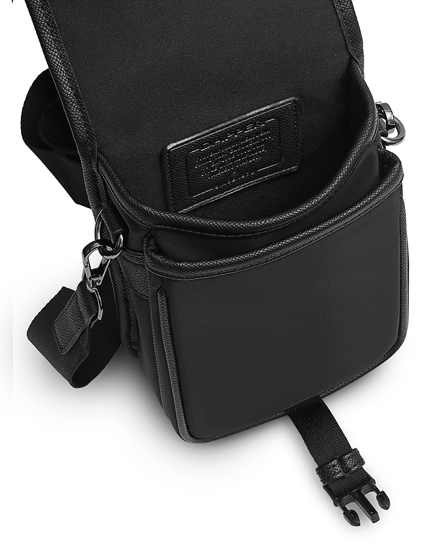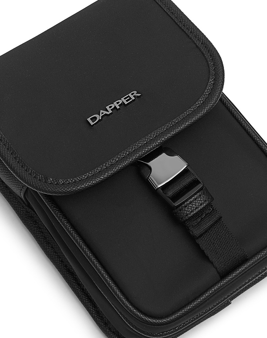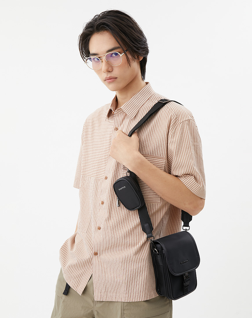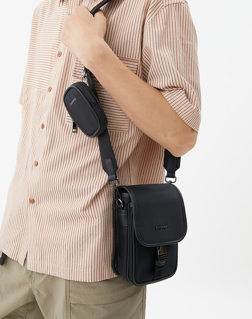 DAPPER Flap crossbody bag with Detachable mini pouch, This flap bag combines Cross grain faux leather and Smooth Nylon fabric with Dapper shiny black metal emblem on front part. External flap pocket with shiny black side-release buckle match with zip puller, D-ring, Dogleash and Adjustable square ring. Monochrome colour in black easy to match with modern style. Mini pouch with metal snap hook.