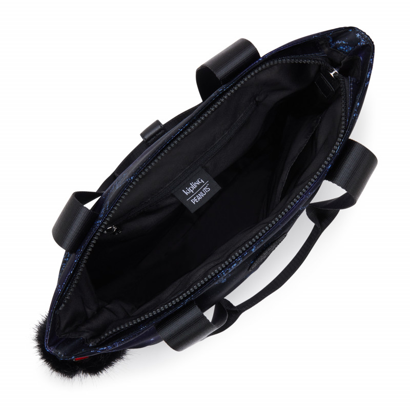 A dose of childhood nostalgia and carefree fun, this one is for the dreamers! We've teamed up with the legendary Peanuts to craft this super-chill, denim-like tote bag featuring Snoopy in a distinctive, hand-drawn style. Details include a silver Kipling logo, a bright red interior lining with Snoopy graphics, and our iconic monkey keychain wearing a red sweater and sunglasses in the style of Snoopy’s "Joe Cool" persona. Use Merita S for the commute or to travel. It'll fit everything you need, plus an ipad or laptop.