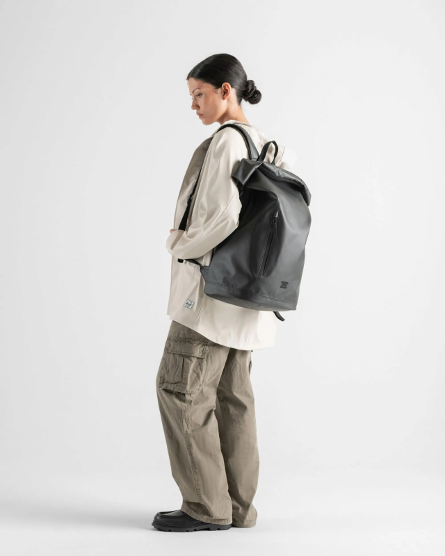 We know rain. Constructed with a matte coating, the Weather Resistant Roll Top Backpack is inspired by rainy commutes in Vancouver, BC. It features a roll-up sealing system to keep your tech and essentials dry on daily journeys.