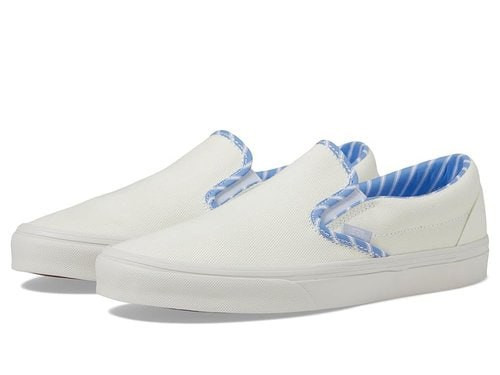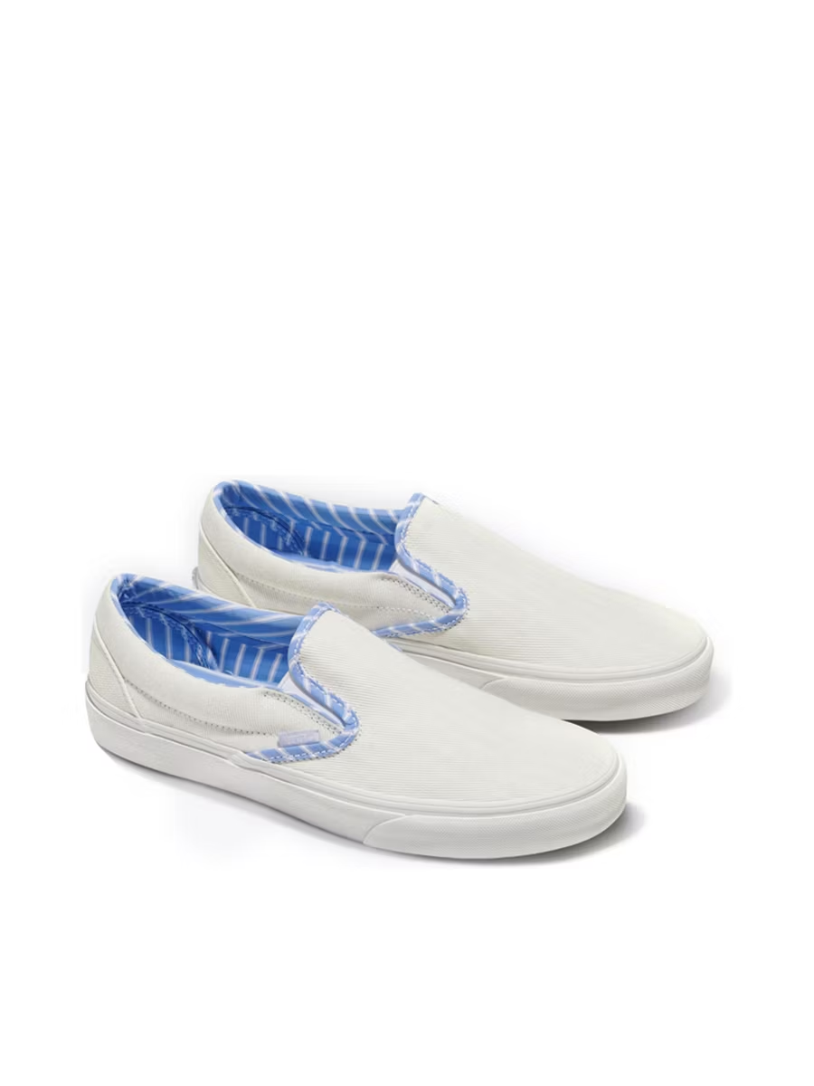 With blue striped trim popping against solid white uppers, the unmistakable Vans heel tab, supportive padded collars and signature rubber waffle outsole, Vans Classic Slip Ons are a timeless silhouette that’s right for any occasion.