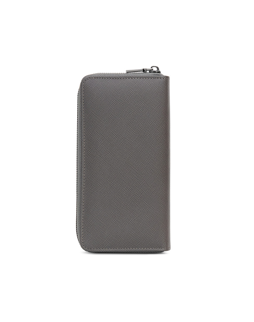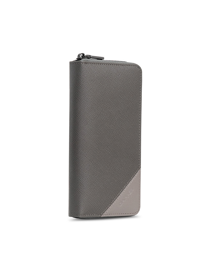 Accordion Long Wallet in black Cross Grain leather. Zip-around closure with two full length bill compartment twelve credit card and coin pocket with zipper Body made from genuine leather in grey & taupe Diagonal corner with Dapper logo
