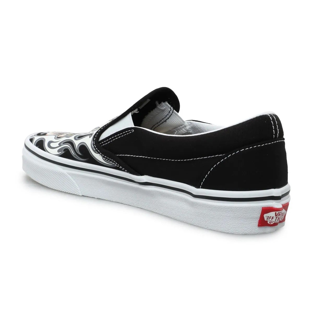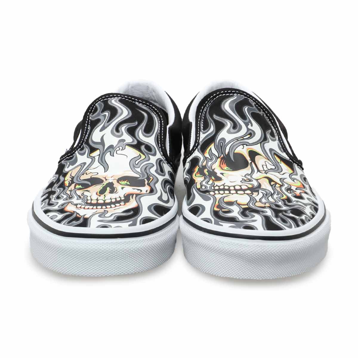 Released in 1977, the Vans Classic Slip-On is known worldwide since then for its comfortable silhouette, easy wearability, and beloved design. This pair features a black canvas construction highlighted by a skull and flame print on top and sits atop a rubber sole for traction.