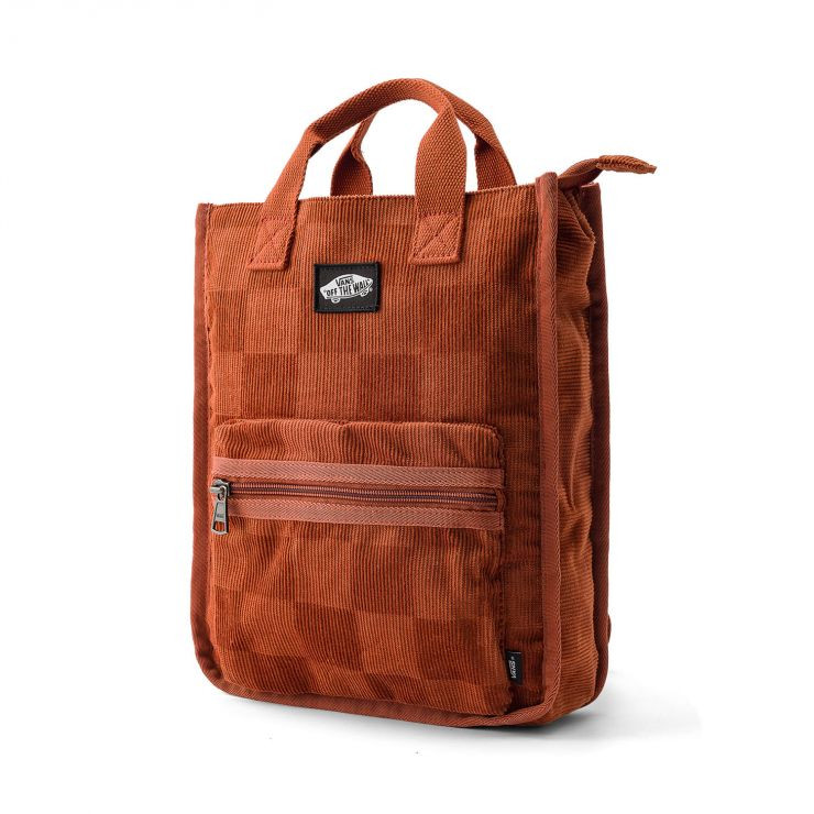 The Free Hand Backpack is a cotton tote backpack with adjustable web straps and features a tonal checkerboard pattern, top handle, and a front zip compartment for added storage and organization.