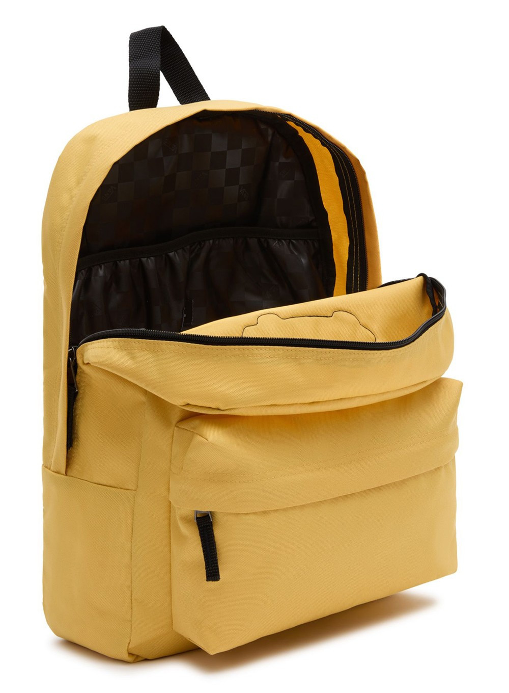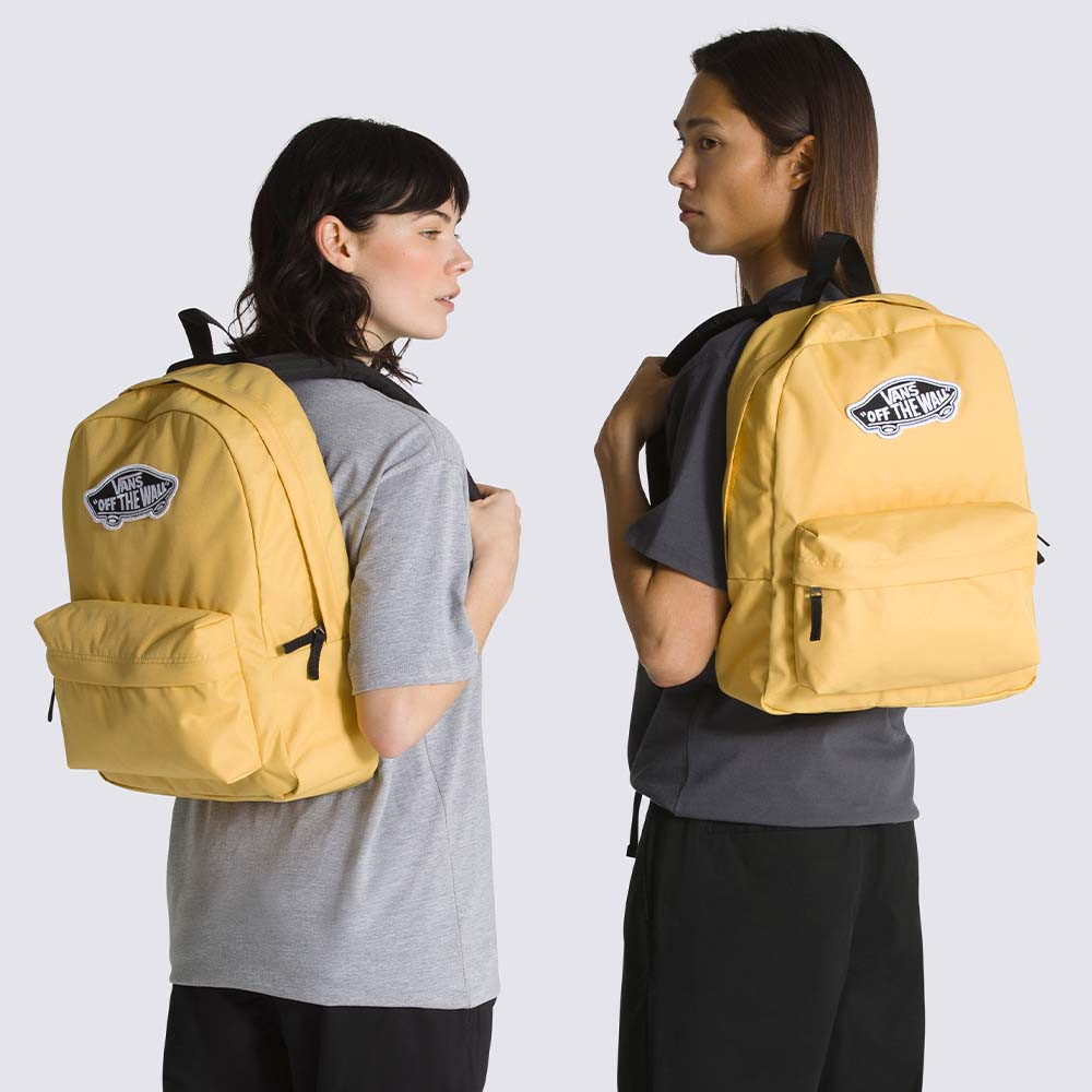 The Realm Backpack is a recycled polyester backpack with two pockets, a main zippered compartment, an internal laptop sleeve, a front organization pocket, adjustable padded straps, and a taped lining on the interior back panel.